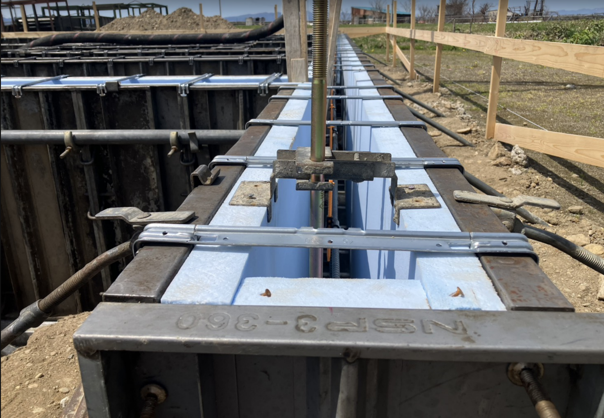 この青いものが断熱材です。その間に基礎のコンクリートを流し込んでいくんですね。