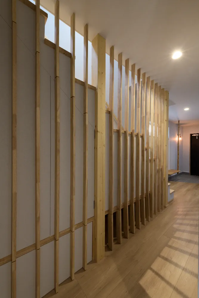 グレーの塗り壁とガルバリウム、木の格子がアクセントの外観です。 また、車2台分のインナーガレージ。 雨に濡れずに家の中に入ることが可能です。