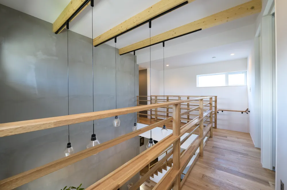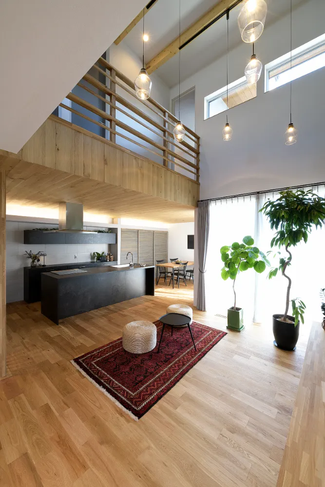 大きな吹き抜けに印象的なペンダントライト。 ありきたりじゃないかっこいい空間をつくりました。