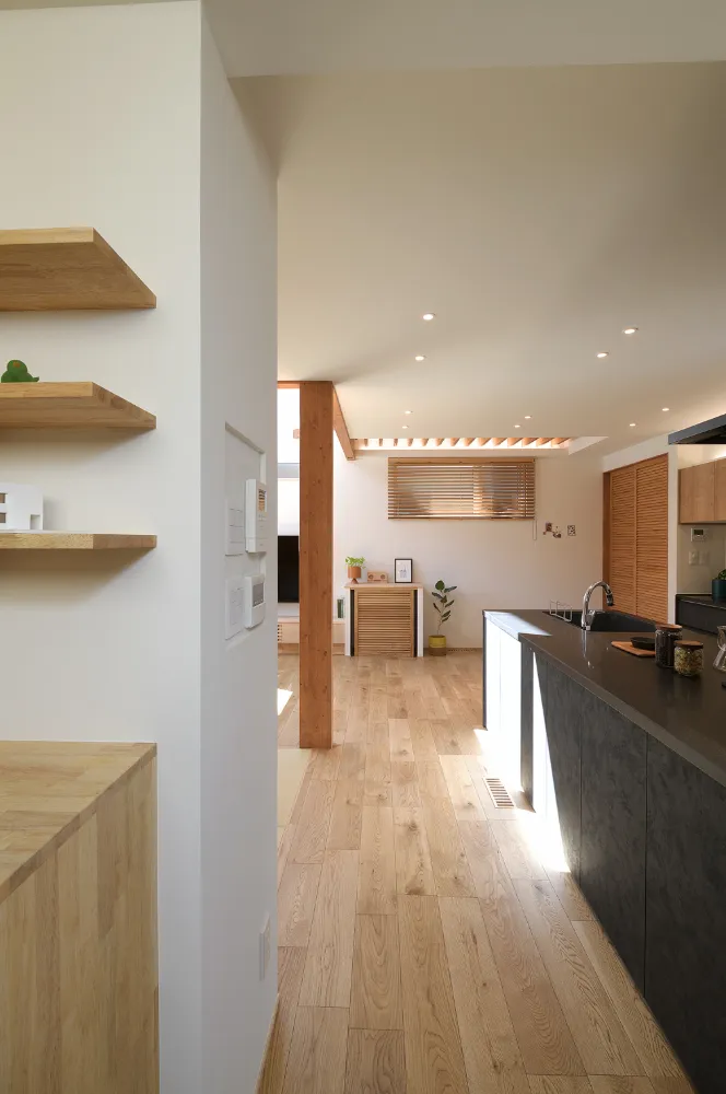 キッチンとダイニングは横並びにして、そこからリビングや和室まで見渡せる配置に。
