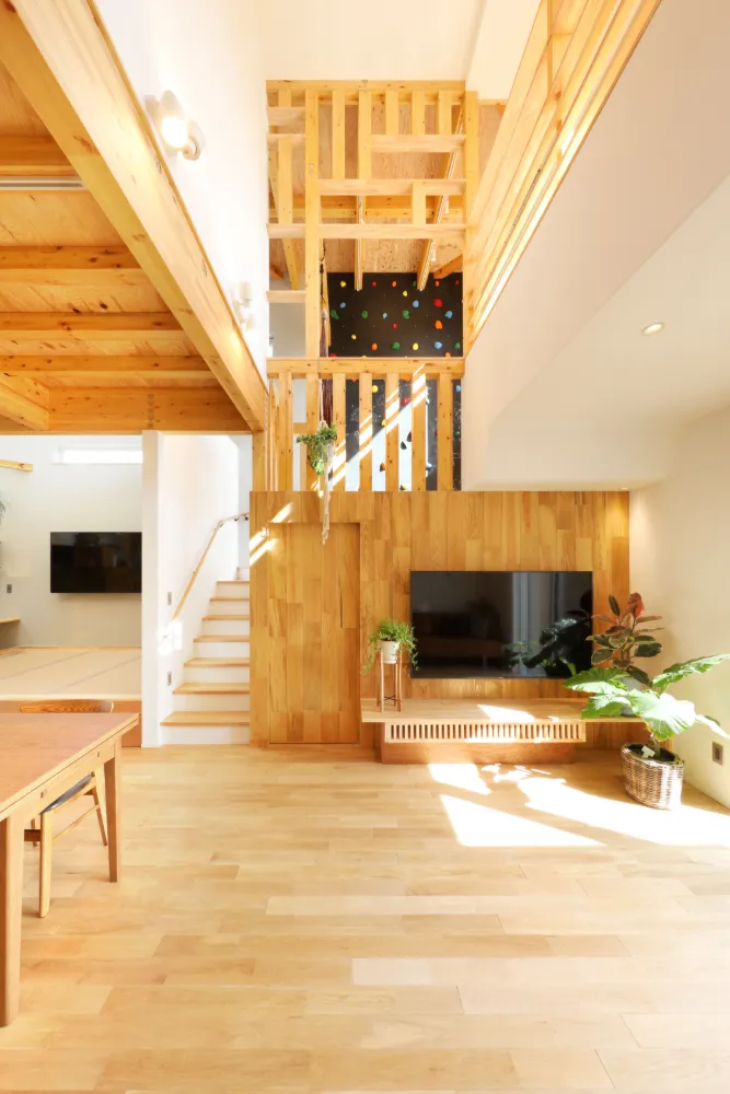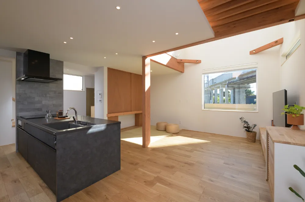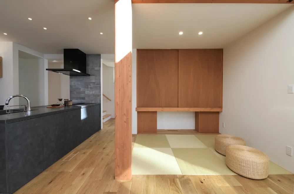リビングには小上がりを設けました。 キッチンからも見守りが出来、ライフスタイルに合わせて様々な使い方が出来ます。