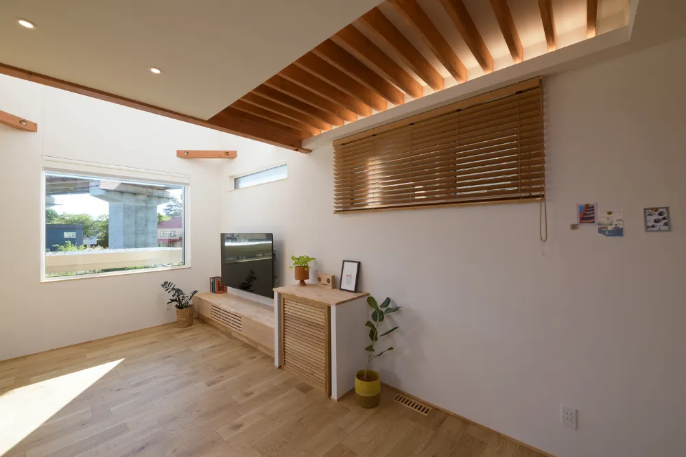小上がりは吹き抜けにし、トップライト(天窓)を設けました。 天窓は太陽の位置に左右されることなく安定した採光効果が期待できます。
