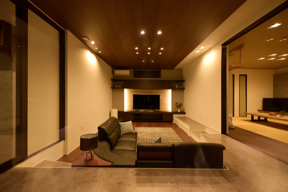 木の温もりを感じる天井とやわらかな間接照明。 低めに抑えた天井が、リビングに「守られているような安心感」を与えます