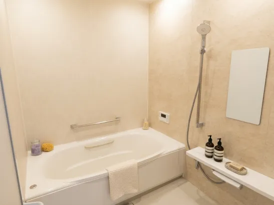 室内は光と質感が美しく調和するモダンな空間に仕上げました。壁面の埋め込み型テレビと洗練された間接照明は、静寂な大人の時間を演出。