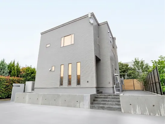 ブラックとホワイトの対比が美しい、モダンなツートンカラーの外観。機能面では、広々としたガレージと、雨の日も濡れずに移動できる深い軒下のポーチを完備。