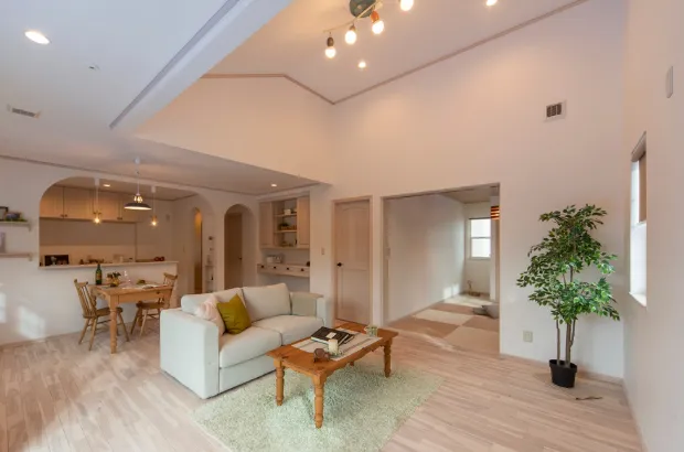 半円型の窓から陽ざしが入り込む、明るいリビングです。