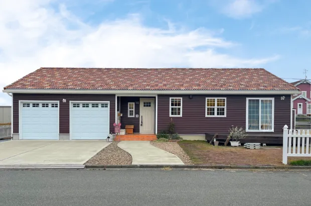 ワインレッドの窓装飾がポイントの外観。 塗り壁は光触媒効果のあるスタッコフレックスを採用し、汚れにくく。 丈夫な瓦屋根は見た目もかわいいです。