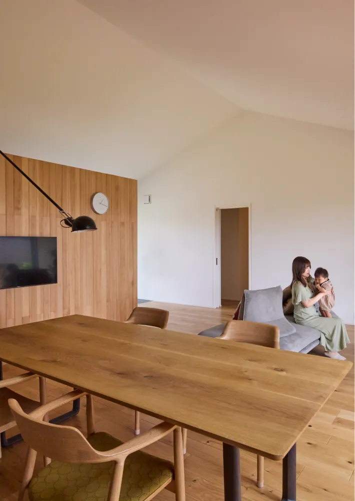担当者:のびやかな空間を活かすため、梁や凹凸をできるだけ見せない設計にしました。平屋ならではの横への広がりに、縦の開放感を加えることで、家全体がより伸びやかに感じられるよう計画しています。 ※床材:朝日ウッドテック 無垢挽板フローリング クリアバーチ