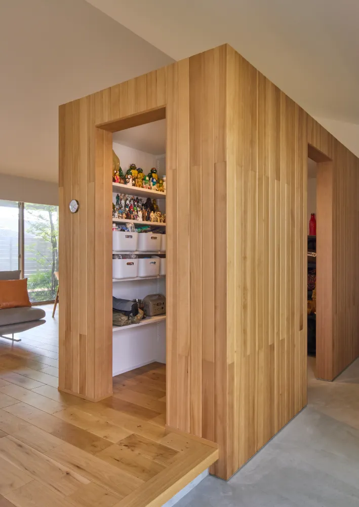 N様:家の中心近くにあるので、どこからでも使いやすく、助かってます。 帰宅後すぐに着替えられて、そのまま手洗いやお風呂に行ける動線も便利ですね。家族みんなが自然と使う場所になっています。 担当者:ファミリークローゼットを動線の中心に据えることで、整理整頓がしやすくなるよう計画しました。 「片付ける」ことを意識しなくても、家がきれいになる仕組みになっています。