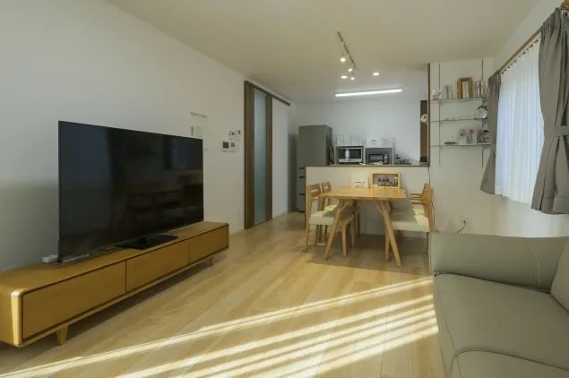 パステルカラーの壁紙をアクセントに採り入れた、軽やかで優しい雰囲気を醸し出すLDK。 食卓を照らすスポットライトの効果でダイニングが特別な場所に。