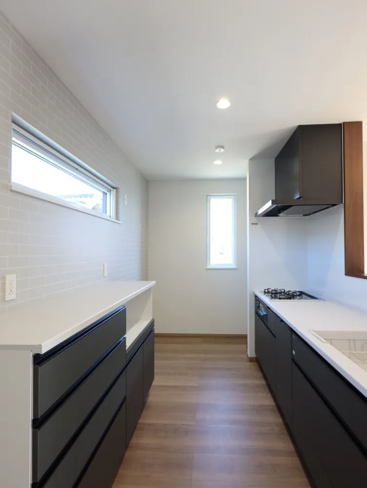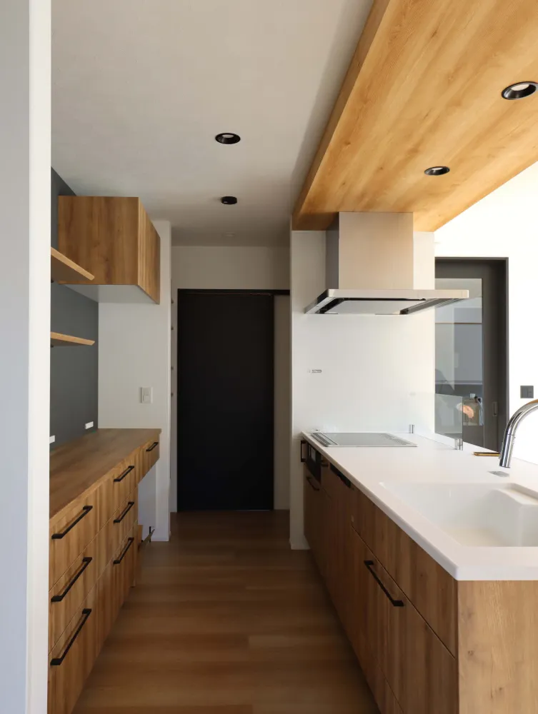 天井の一部を木目調に下げてダウンライトを配することで、キッチンエリアに心地よい落ち着きを演出。