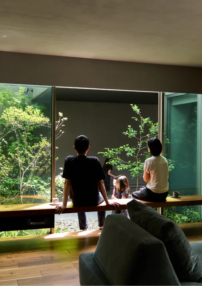 中庭からの光を室内に落とし込み、あえて陰影を残す設計に。明るさ一辺倒ではなく、光と影のバランスを大切にしました。