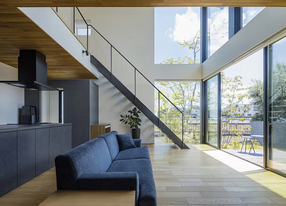 道路側の開口が少なく、中庭側に大きく開くコートハウスの構成です。カーテンを使わずやわらかい自然光を取り込むことができ、心地よく過ごせる住まいになっています。
