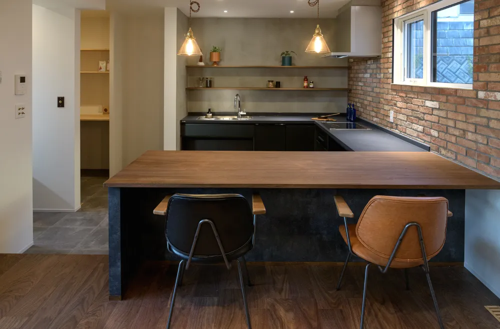 まるでカフェのようなキッチン。 毎日の食事や、お酒やコーヒーを飲む時間も特別なひと時を演出してくれそうです。 ご家族みんなで料理が楽しめるように作業スペースを広くしました。