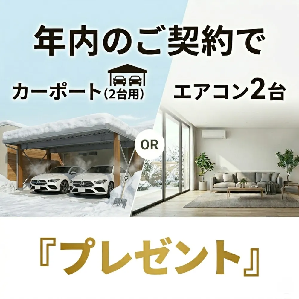 年内に新築のご契約をいただいたお客様へ、これからの暮らしをより快適にする「選べる豪華設備」を差し上げます。 【AまたはB 選べるご成約特典】 A:カーポート(2台用) 冬の雪かき軽減や、夏の日差しから愛車を守る必須アイテム。 B:エアコン(2台) 引っ越し当日から快適。リビングや寝室など、ご希望の部屋に設置いたします。 ※2026年12月最終営業日までのご成約に限ります。 ※当社指定の商品となります。詳細はスタッフまでお尋ねください。