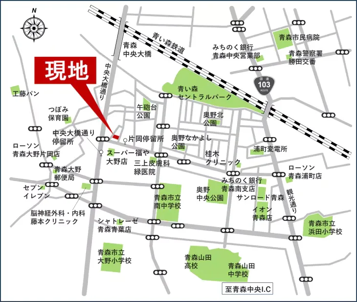 最寄バス停「片岡」停留所まで徒歩2分~3分、「青森市営バス(浪館中央循環/青森駅前行)」に乗車、JR奥羽本線青森駅まで26分 最寄バス停「中央大橋通り」停留所まで徒歩3分(最長)、「青森市営バス(国道・古川線/青森駅前行)」に乗車、JR奥羽本線青森駅まで15分
